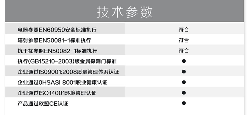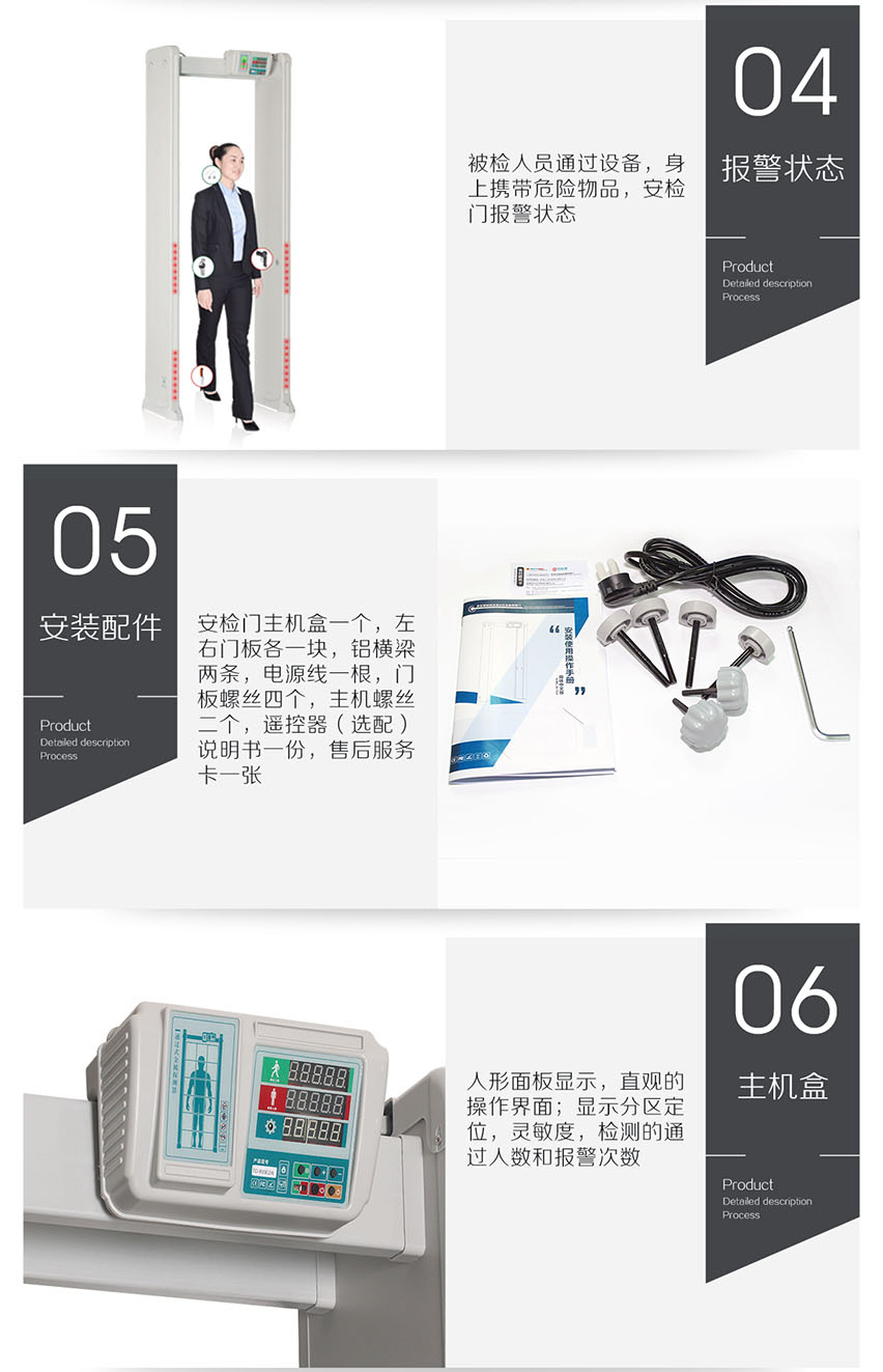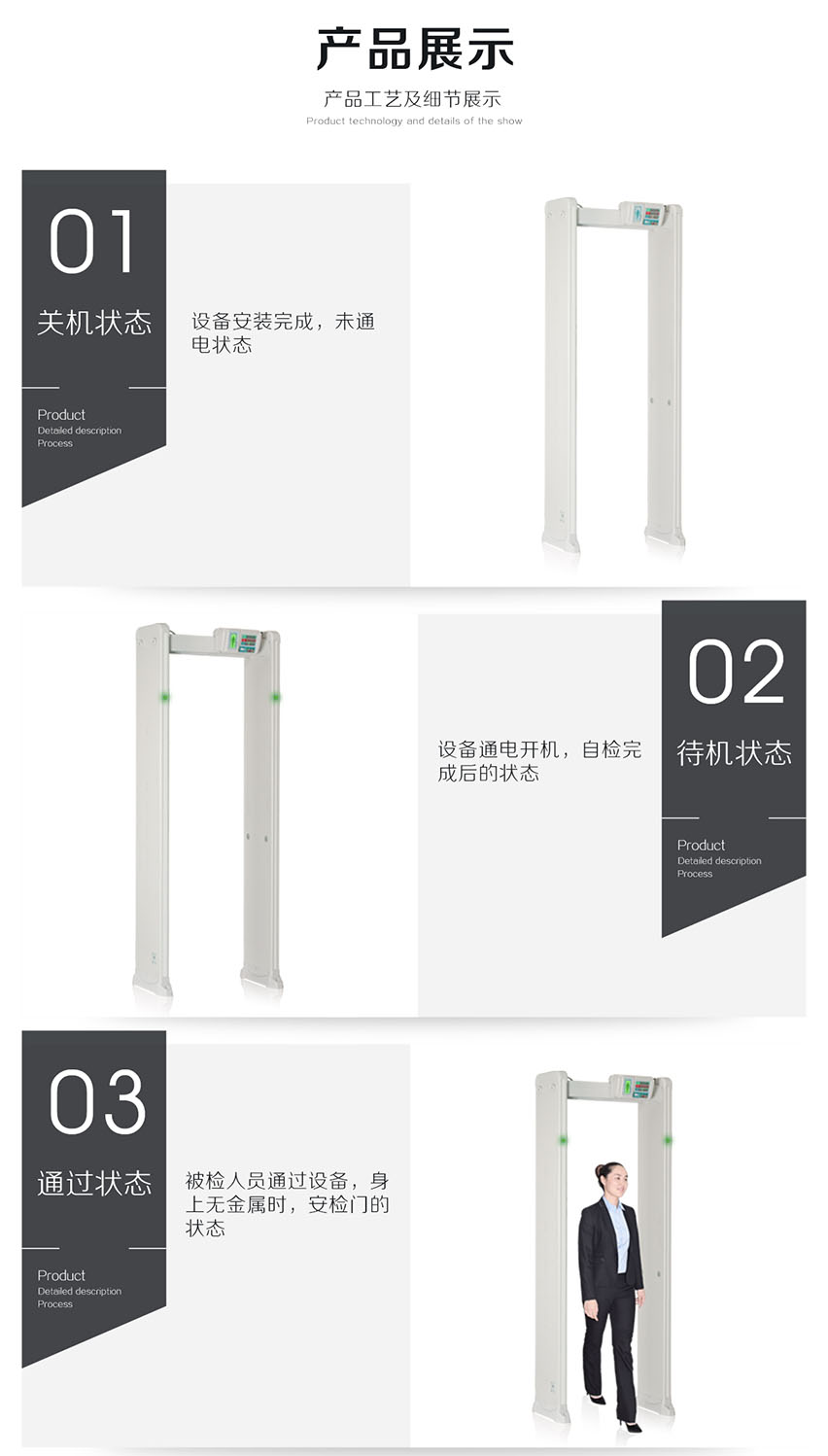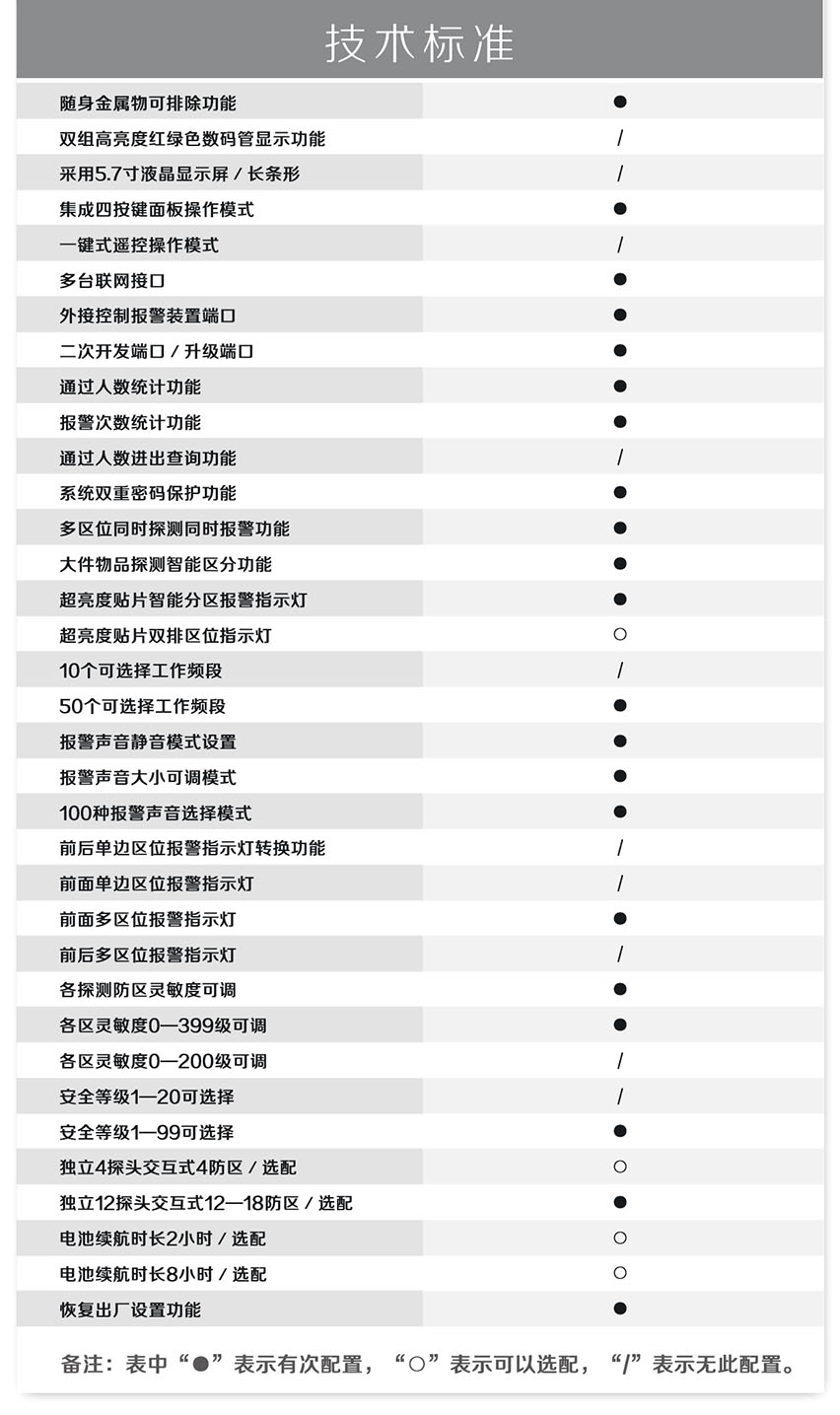 HC-TY300D金屬探測門(橫梁式)感應(yīng)快、探測準(zhǔn)、靈敏度高、抗干擾強(qiáng)、高穩(wěn)定性,電源設(shè)計(jì)在主機(jī)頂端,防水防潮,非常人性化;能滿足各行業(yè)用戶需求。此款安檢門嚴(yán)格執(zhí)行國家《GB15210-2003通過式金屬探測門技術(shù)通用技術(shù)規(guī)范》;